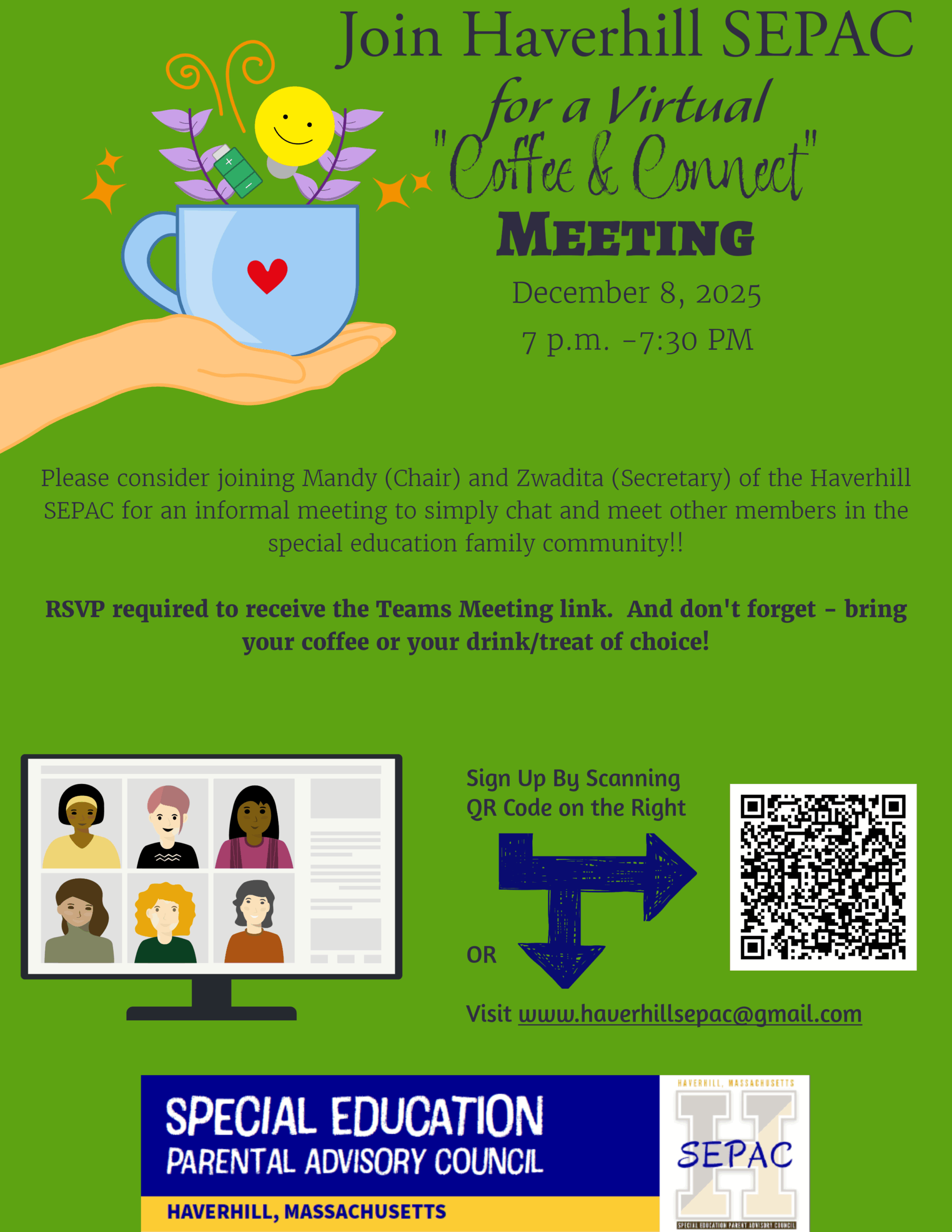 Please consider joining Mandy (Chair) and Zwadita (Secretary) of the Haverhill SEPAC for an informal meeting to simply chat and meet other members in the special education family community!!