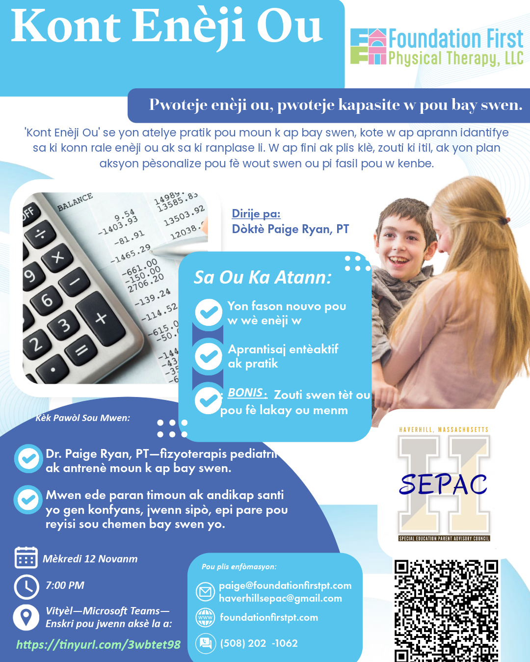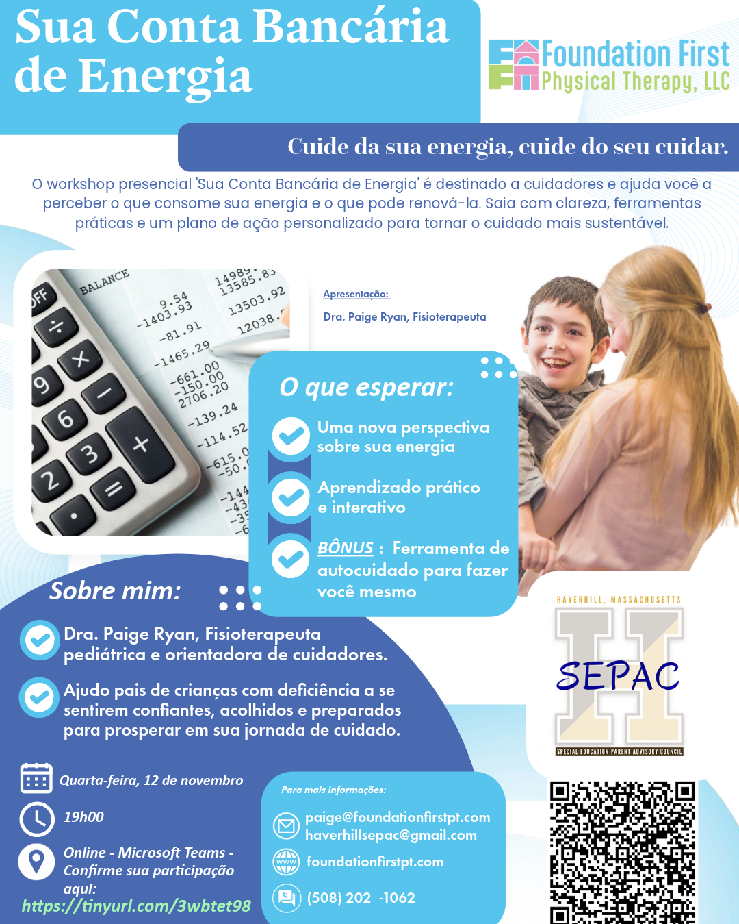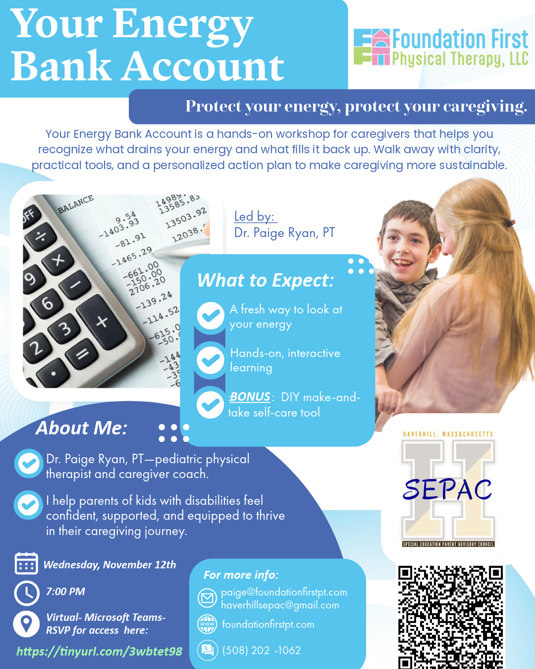 You are invited to join Haverhill SEPAC for their Caregiver Series: Your Energy Bank Account featuring Dr. Paige Ryan, PT – Pediatric Physical Therapist and Caregiver Coach