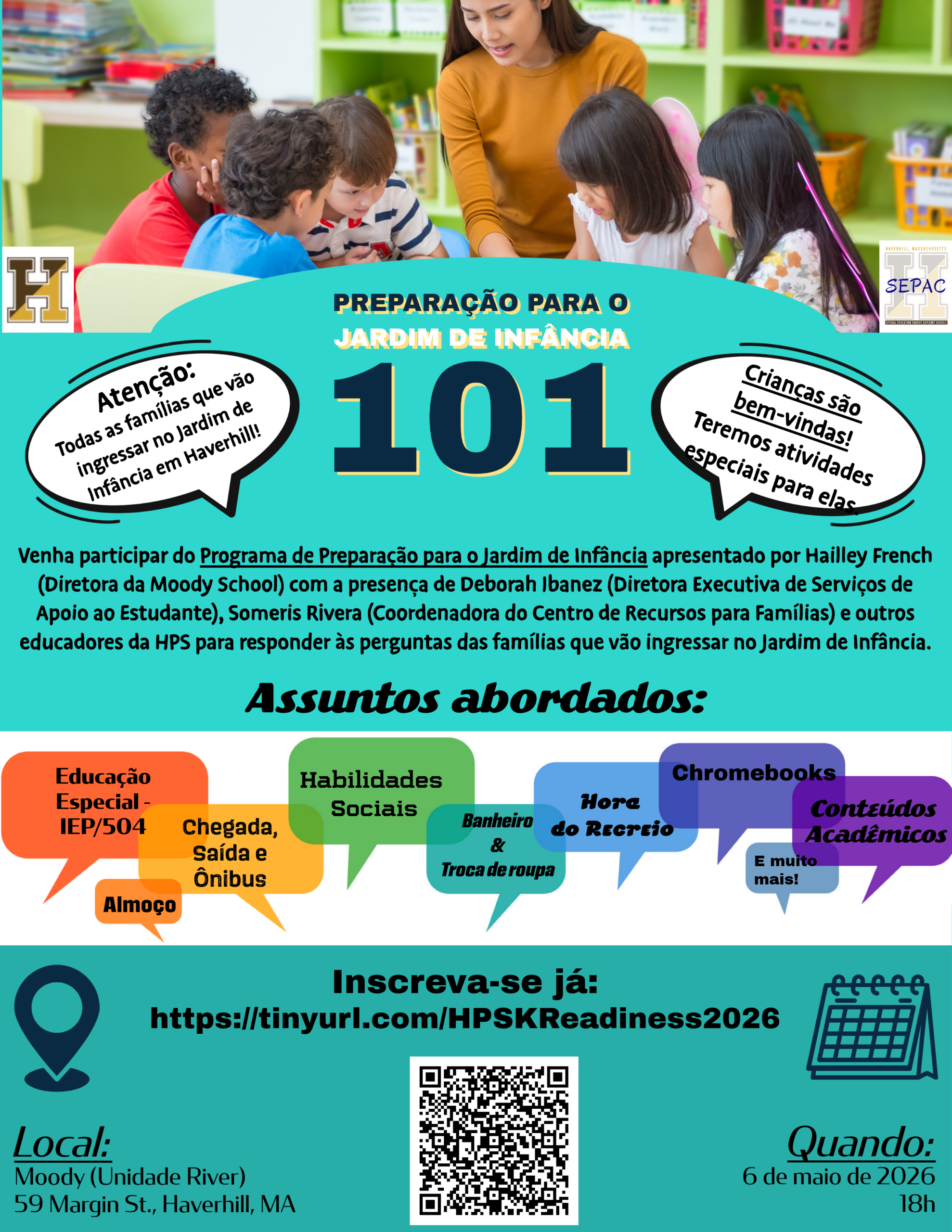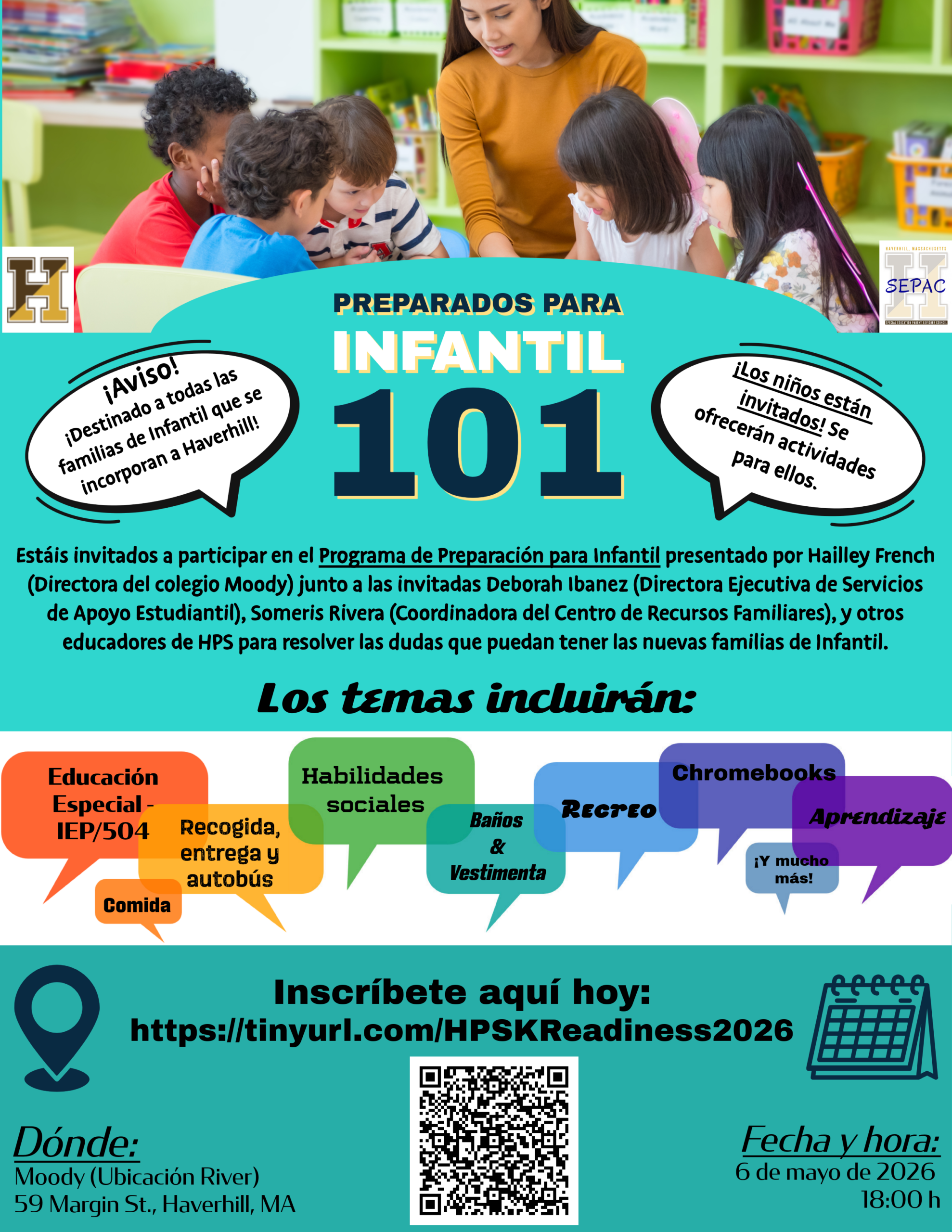 You are invited to attend a Kindergarten Readiness Program presented by Hailley French (Principal of Moody School) with guests Deborah Ibanez (Executive Director of Student Support Services), Someris Rivera (Family Resource Center Coordinator), and other HPS educators to answer the questions that incoming Kindergarten families may have.